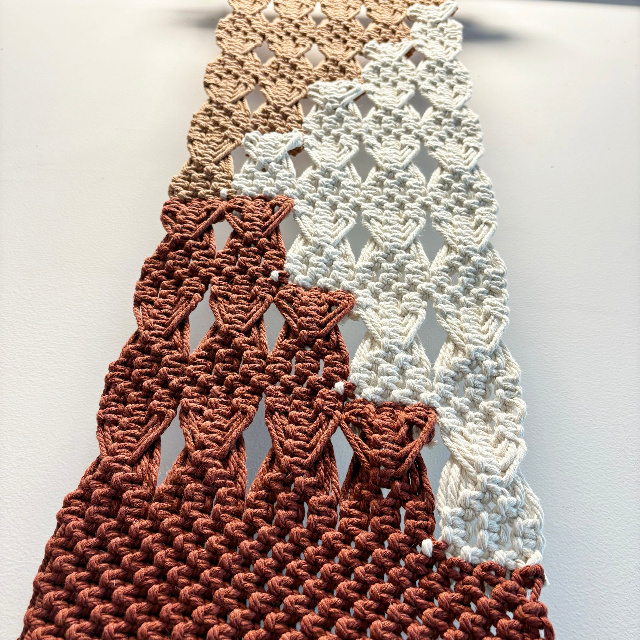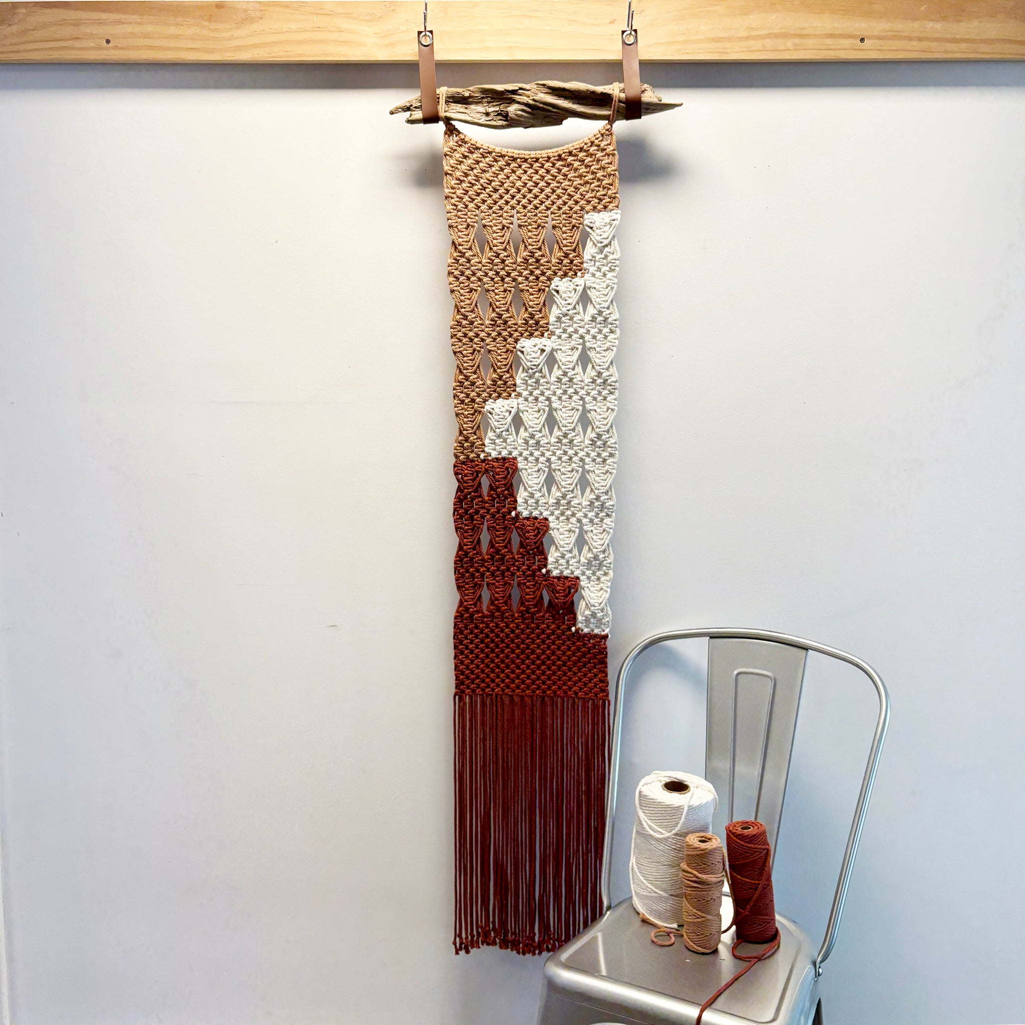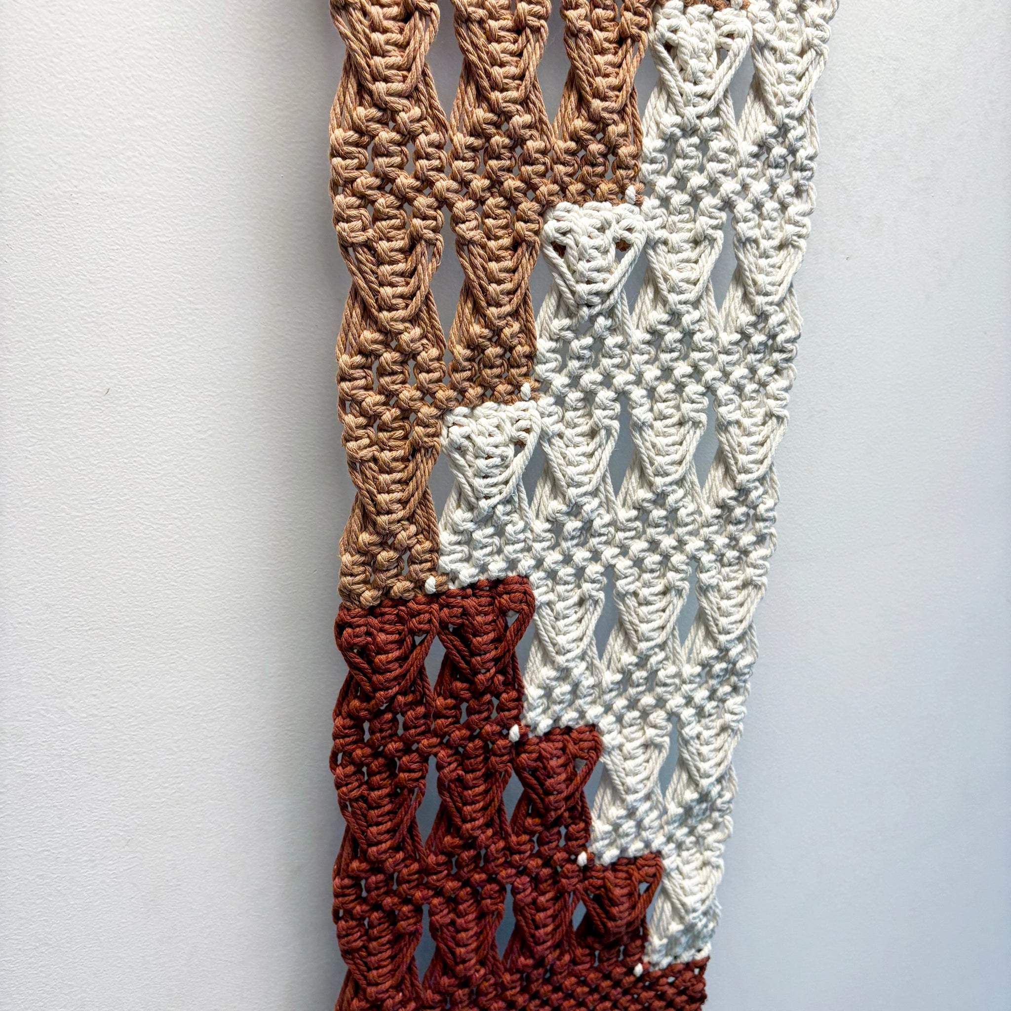 A vertical macramé wall hanging inspired by the layered tones and textures of Antelope Canyon, handcrafted with sculptural detail and modern desert hues.