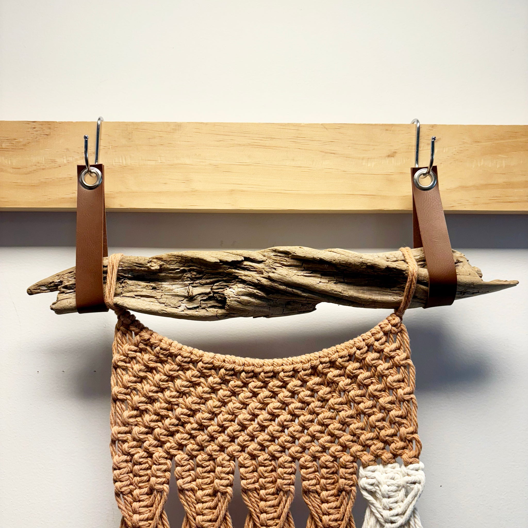 - Mounting: Natural driftwood with brown vegan leather hanging hardware (included)