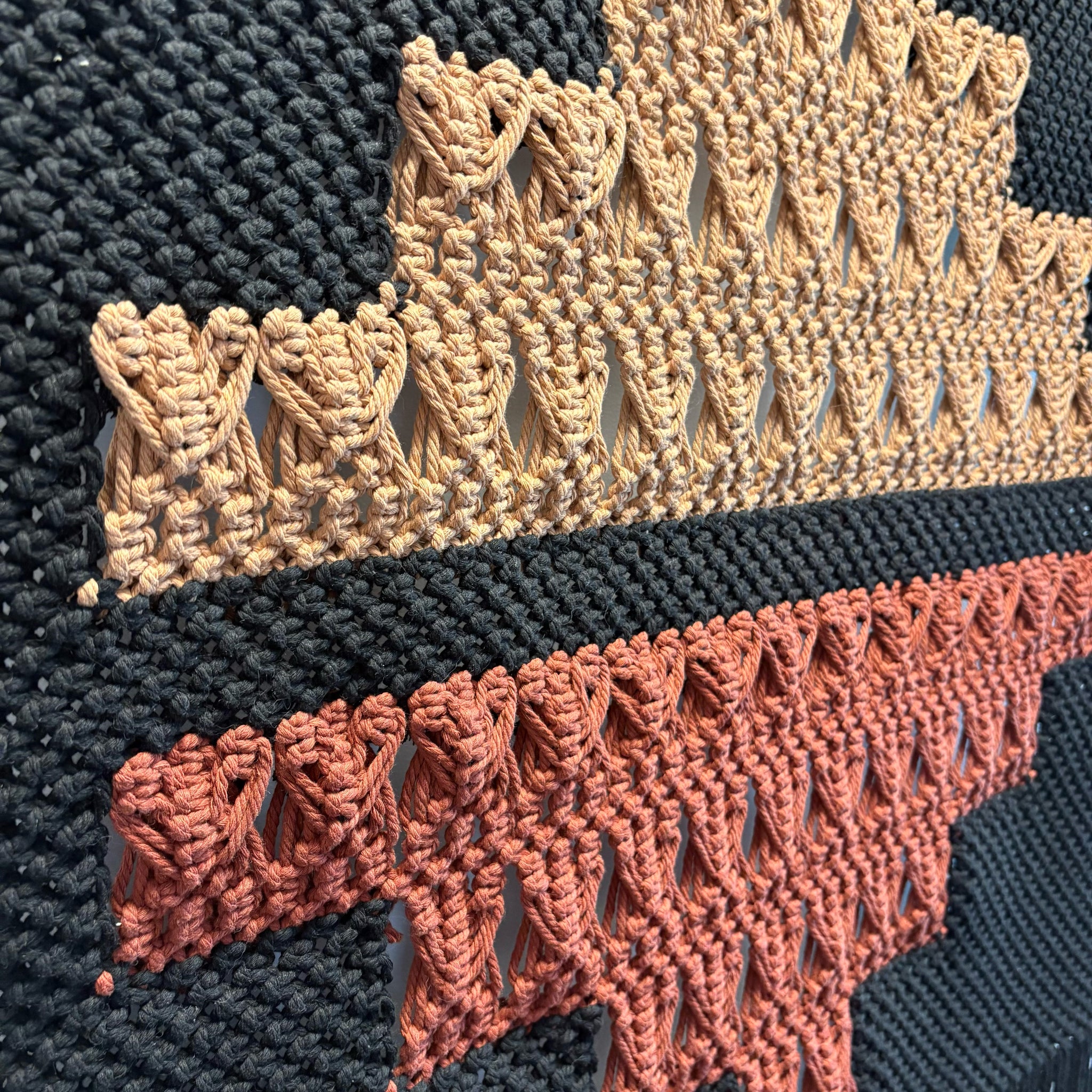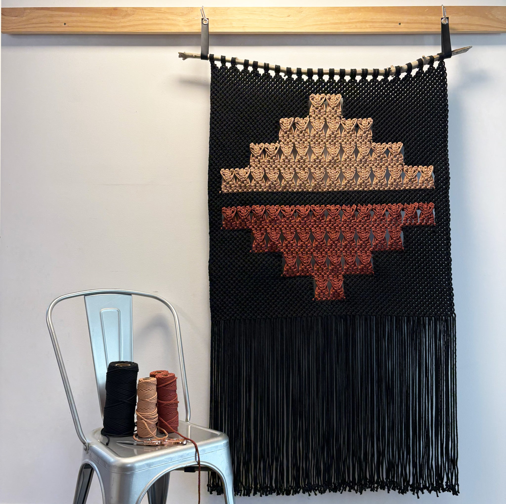 Note from the Artist: This piece was inspired by the striking silhouettes and tonal shifts I experienced while exploring Lower Antelope Canyon. The composition echoes the layered steps and stacked formations carved by time, wind, and water. I worked with rich desert hues—clay, terracotta, and black—to reflect the contrast between illuminated sandstone and the deep shadows found within the canyon walls. Every knot holds the memory of that moment—still, grounded, and intentionally made.